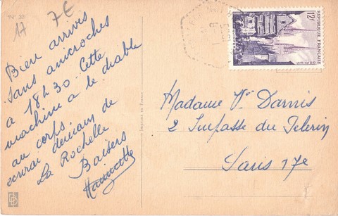 La carte ci-contre a été retrouvée récemment par hasard sur internet. Elle a été postée en août 1955, c’est à dire il y a 68 ans. J’avais alors 6 ans et nous arrivions en vacances chez l’arrière grand-mère Tranchaud Eugénie qui nous accueillait pour 2, (peut-être 3) semaines. Ma petite sœur (Betty) avait 2 ans, et nous avions fait le voyage (un périple à l’époque) avec une moto (une Indian beige et bleue) à laquelle était accroché un side-car. Je voyageais calé au fond du side, tandis que notre mère tenait la petite sœur dans ses bras. Les maigres bagages étaient dans les sacoches et arrimés sur l’arrière de la moto.